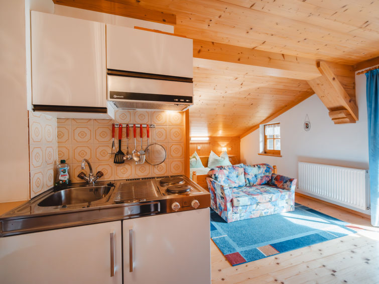"Weissbacher", 1-Zimmer-Wohnung 28 m2 im 1. Stock. Gemütlich und mit viel Holz eingerichtet: Wohn-/Schlafzimmer mit 1 Doppelbett, Esstisch und Essecke. Kochnische (2 Kochplatten, Backofen, Wasserkocher, elektrische Kaffeemaschine). Dusche/WC. Heizung. 1 Haustier/Hund erlaubt. 50620-000788-2022