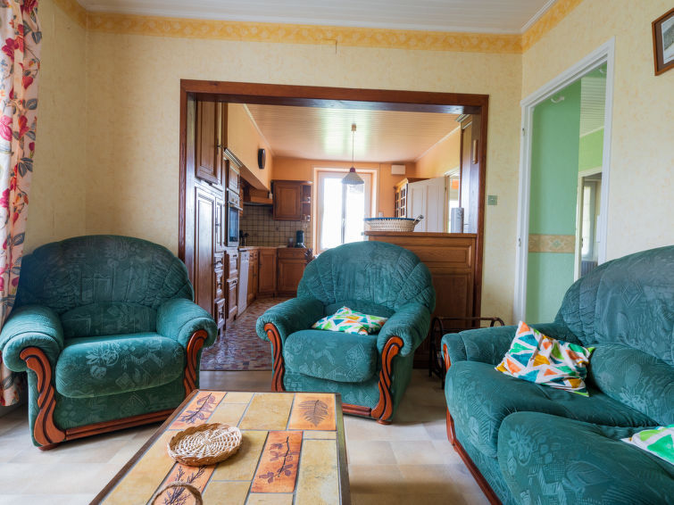 Huis 5-kamers 110 m2 op 2 verdiepingen. Comfortabel en mooi ingericht: woon-/eetkamer 25 m2 met TV (Flatscreen TV), houtkachel. Keuken 15 m2 (oven, afwasmachine, 4 inductiekookplaten, broodrooster, waterkoker, magnetron, elektrische koffiemachine, pads voor de koffiemachine (SENSEO) extra) met eettafel. Aparte WC. Bovenverdieping: 3 kamers, elke kamer heeft 1 2-pers bed (140 cm, lengte 200 cm). 1 kamer met 1 bed (90 cm, lengte 200 cm). Badkamer. Elektrische verwarming. Terras 9 m2, overdekt. Terrasmeubelen, barbecue, ligstoelen (2). Ter beschikking: wasmachine. Maximaal 2 huisdieren/honden toegestaan. Rookmelders. Aanbod door een particulier volgens art. 155, IV van CGI.