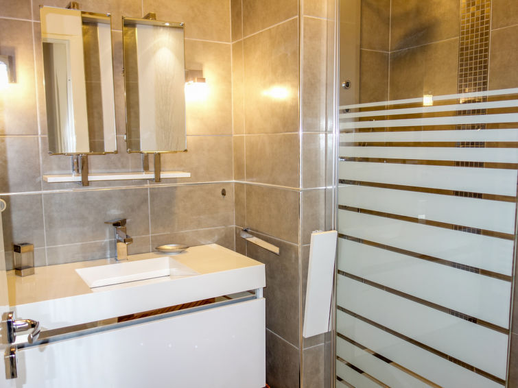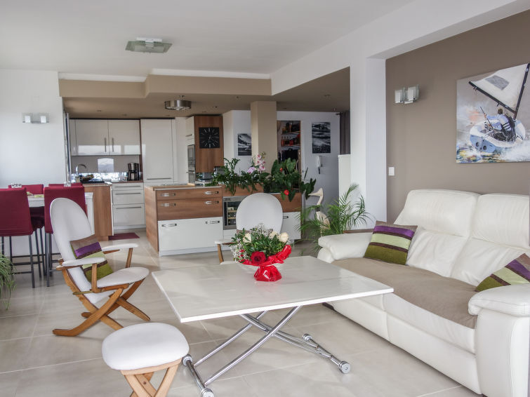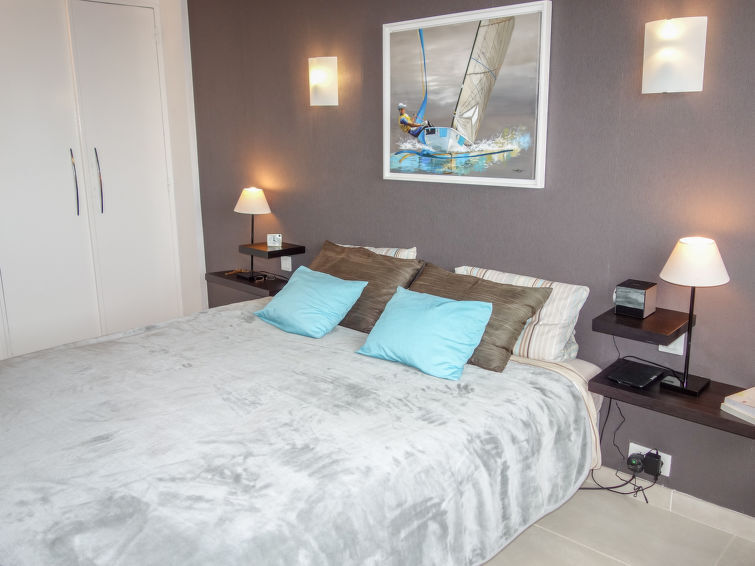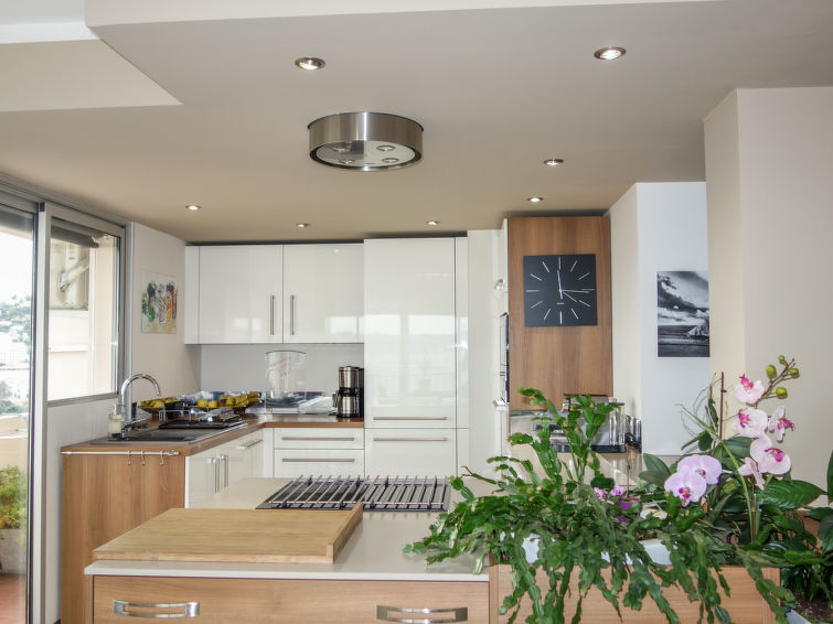 Appartement 3-kamers 80 m2 op de 9e verdieping. Mooi en modern ingericht: woon-/eetkamer met TV (Flatscreen TV), air-conditioning. Uitgang naar het terras. 1 kamer met 1 2-pers bed (1 x 160 cm, lengte 200 cm), TV. 1 kamer met 2 bedden (90 cm, lengte 200 cm). Open keuken (oven, afwasmachine, 3 inductiekookplaten, broodrooster, waterkoker, magnetron, diepvriezer, elektrische koffiemachine, pads voor de koffiemachine (Nespresso) extra). Douche, aparte WC. Elektrische verwarming. Terras 7 m2, overdekt, op het oosten gelegen. Terrasmeubelen. Mooi panoramazicht op zee. Ter beschikking: wasmachine, droger, strijkijzer. Internet (Internet (WiFi), gratis). Parkeerplaats nr. 7. TV alleen FR. Rookmelders. 13028 000644 FA