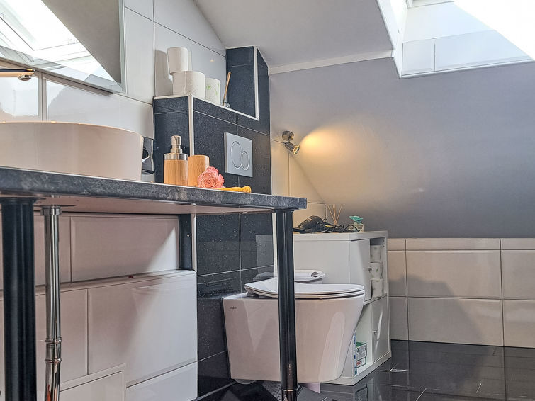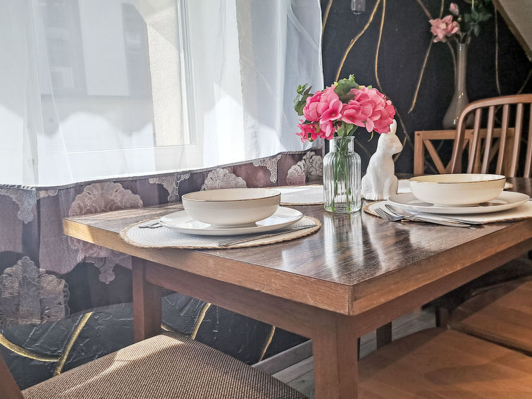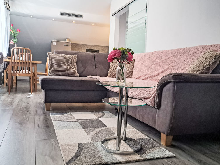 "Siebter Himmel", appartement 2-kamers 55 m2. Het objekt is geschikt voor 2 volwassenen + 2 kinderen. Modern en smaakvol ingericht: hal. Woon-/eetkamer met eettafel, eethoek en Sat-TV. 1 2-pers. kamer. Open keuken (oven, afwasmachine, 4 inductiekookplaten, magnetron, elektrische koffiemachine). Douche/WC. Ter beschikking: wasmachine. Internet (WiFi). 1 huisdier/hond toegestaan. 53104/9757