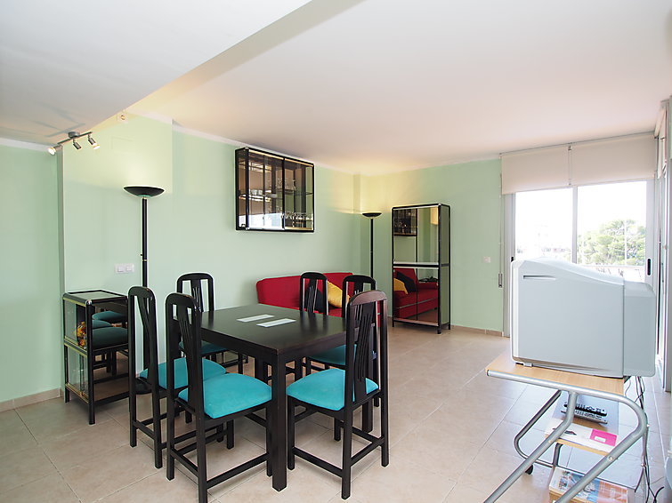 Appartement 3-kamers 52 m2 op de 2e verdieping, op het zuidwesten gelegen. Doelmatig ingericht: woon-/eetkamer met TV. Uitgang naar het balkon. 1 kamer met 1 2-pers bed (135 cm). Uitgang naar het balkon. 1 kamer met 1 x 2 stapelbedden (90 cm). Open keuken (3-pits kookplaat, oven, afwasmachine, magnetron, diepvriezer). Douche/WC. Geen verwarmingsmogelijkheid. Balkon 12 m2. Terrasmeubelen. Mooi panoramazicht op het zwembad, het landschap en het kanaal. Ter beschikking: wasmachine. Parkeerplaats nr. 29 (overdekt). TV alleen ES, DE. HUTG003079 // Reg. Nr.: ESFCTU000017019000379559000000000000000000HUTG0030797